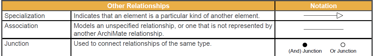 The relationships that can be used in combination with a junction are all the dynamic and dependency relationships, as well as assignment, realization, and association. A junction is used to explicitly express that several elements together participate in the relationship (and junction) or that one of the elements participates in the relationship (or junction). A junction should either have one incoming and more than one outgoing relationships, or more than one incoming and one outgoing. It is allowed to omit arrowheads of relationships leading into a junction. Junctions used on triggering relationships are similar to gateways in BPMN and forks and joins in UML activity diagrams. They can be used to model high-level process flow. A label may be added to outgoing triggering relationships of a junction to indicate a choice, condition, or guard that applies to that relationship. Such a label is only an informal indication. No formal, operational semantics have been defined for these relationships, because implementation-level languages such as BPMN and UML differ in their execution semantics and the ArchiMate language does not want to unduly constrain mappings to such languages