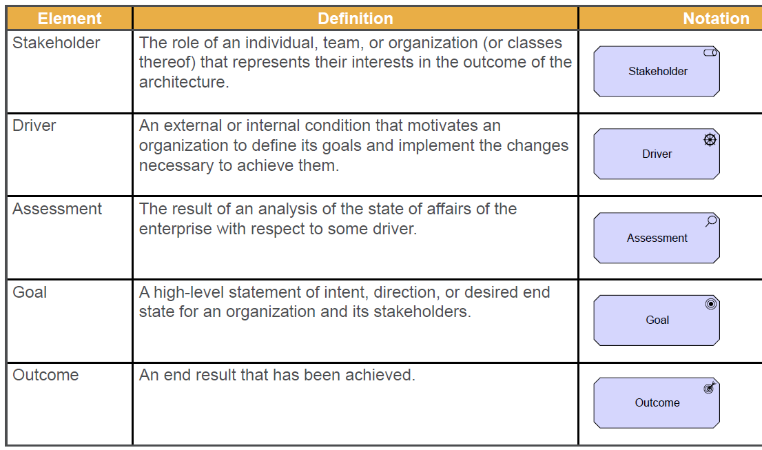 Define the first 5 elements of the motivation, stakeholder, driver, assessment, goal and outcome? and their notation