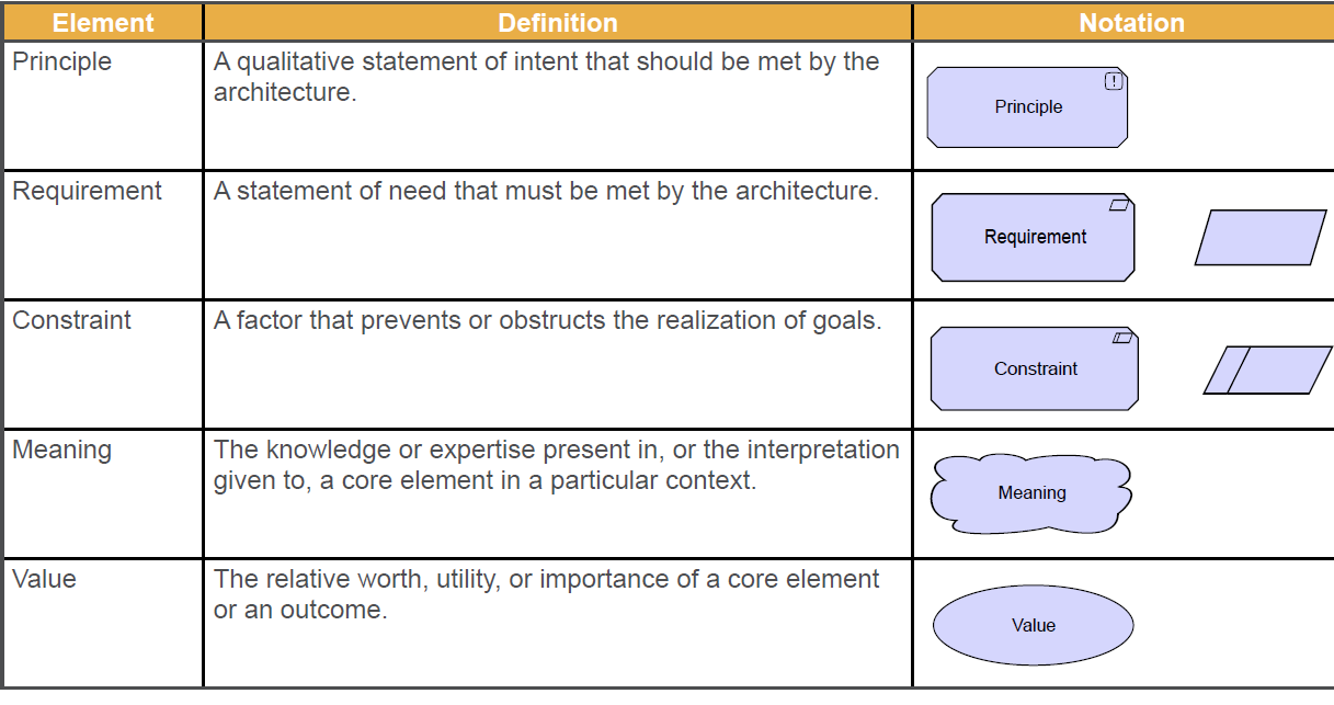 Define the other 5 elements of the motivation?, principle, requirement, constrain, meaning and value and their notation.