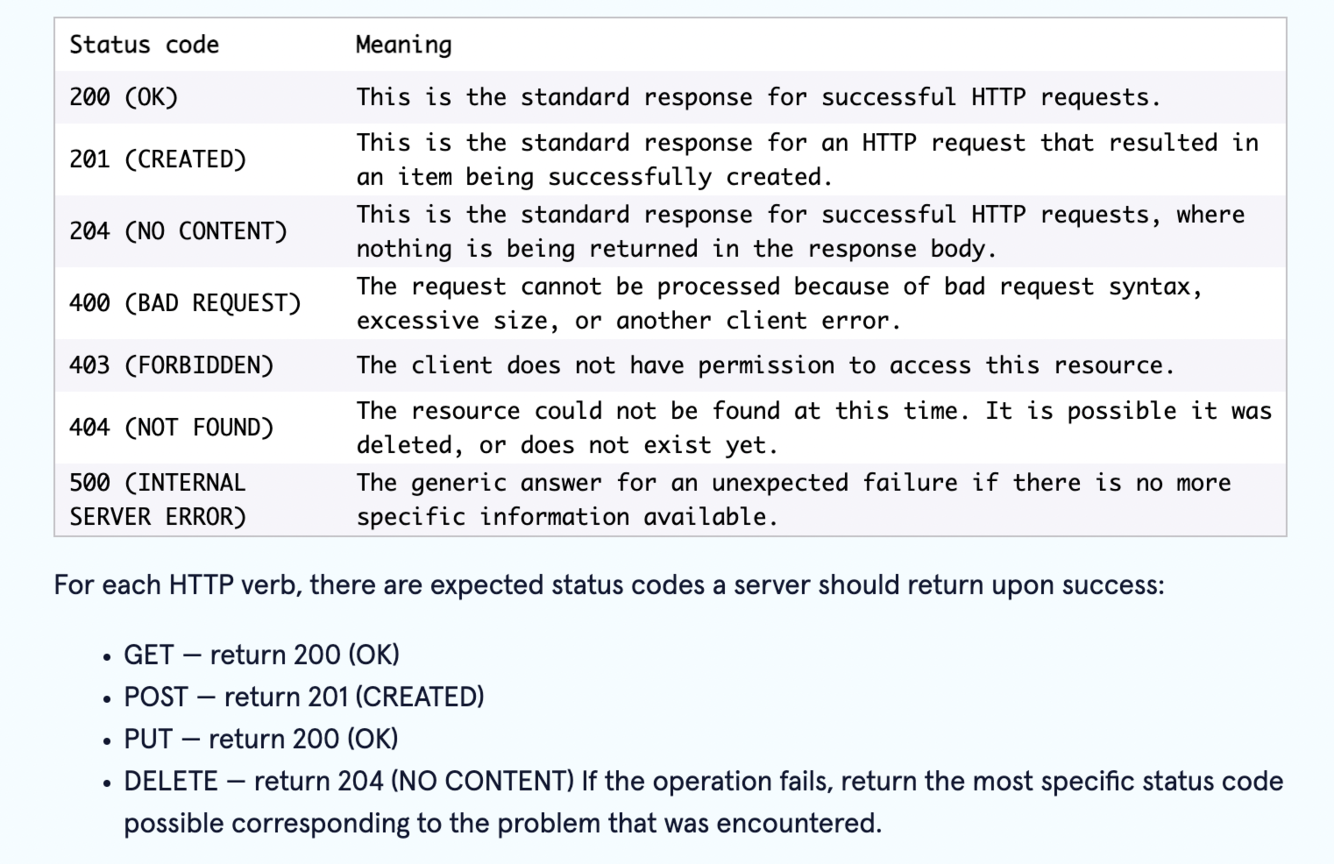 Responses from the server contain status codes to alert the client to information about the success of the operation. As a developer, you do not need to know every status code (there are many of them), but you should know the most common ones and how they are used: