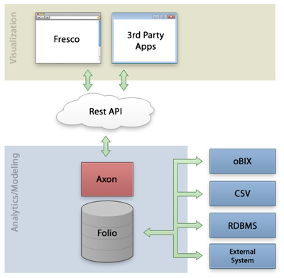 The skyspark executable launches the SkySpark server daemon. The server is bundled with a web server which opens a HTTP port. Web requests to the REST API can be used to query the SkySpark database and execute analytic queries. The server also publishes the data for human consumption via a set of Fresco web pages. Extensions running in-process can be used to synchronize data with external databases or web services.