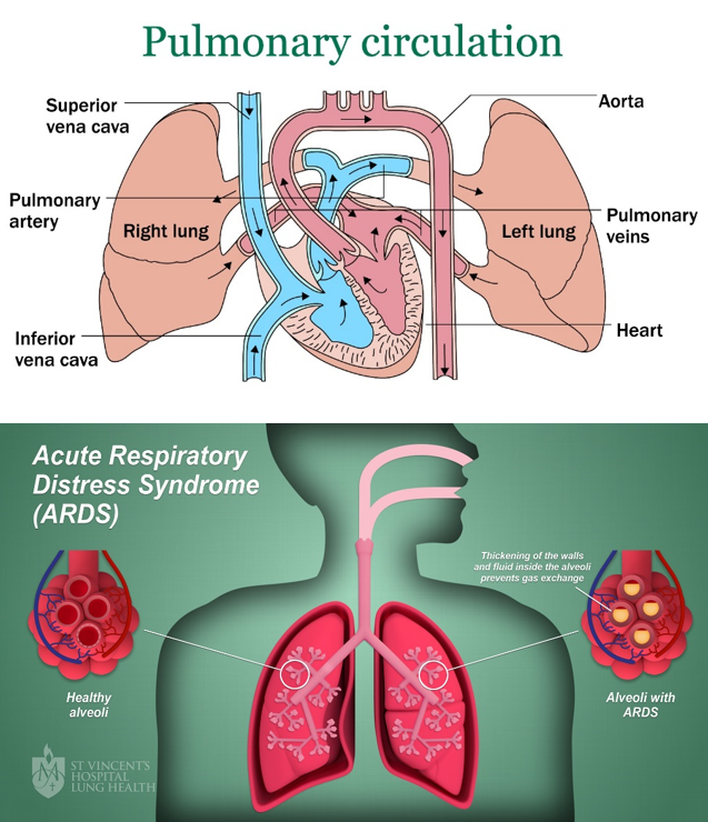 Lung injury → alveoli swell → disrupts surfactant → alveoli collapse (atelectasis) → O2 cannot perfuse (ventilation-perfusion rate uneven) → SHUNT -> blood in lungs backs up -> blood in pulm a. cannot go into lungs -> pulm HTN