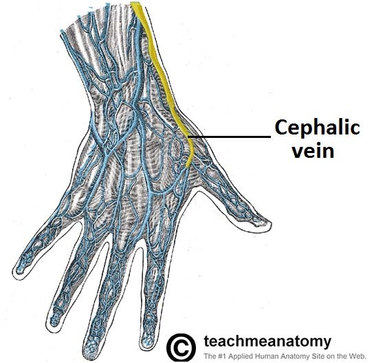 3) Cephalic vein - arises from the dorsal venous network of the hand and crosses the anatomical snuffbox to travel up the anterolateral aspect of the forearm.
