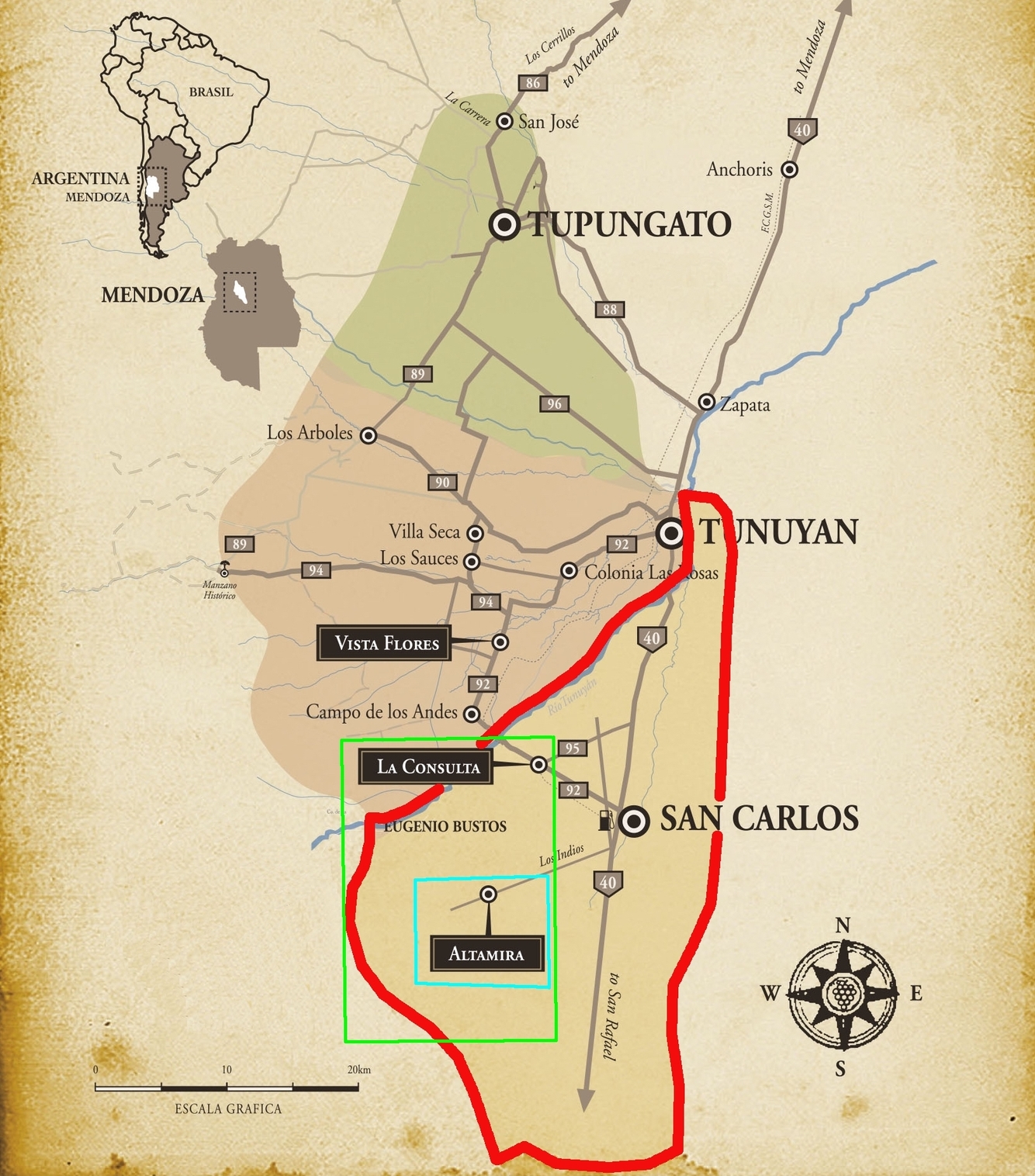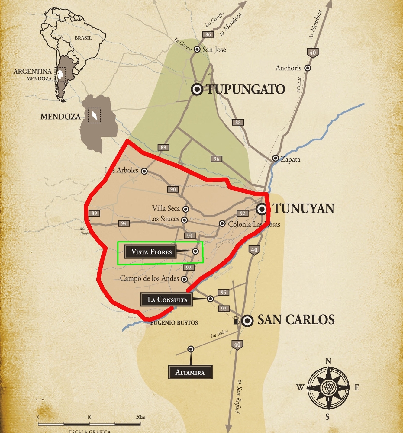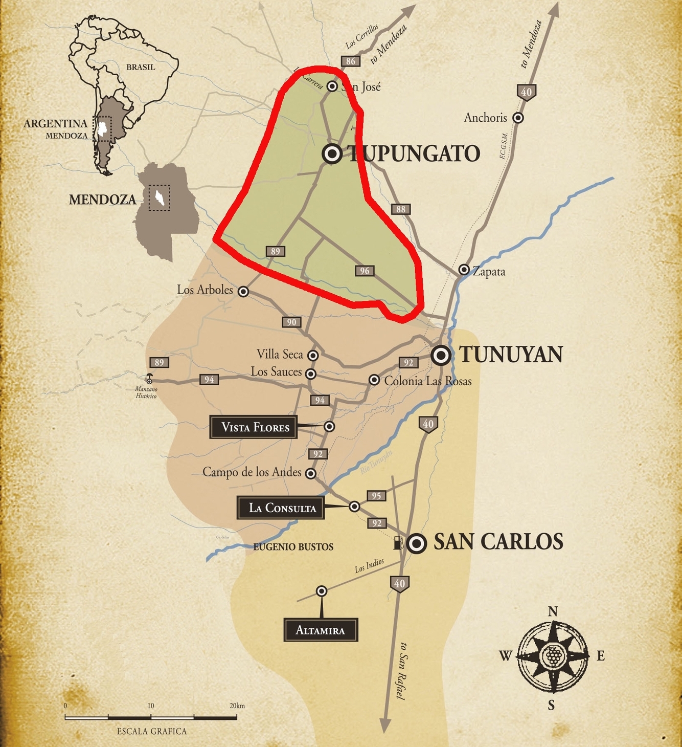 – San Carlos is the southernmost Department. Its vineyards are northeast facing, so they get direct sunshine in the morning and throughout the day. They are the fleshiest and ripest in Uco.
