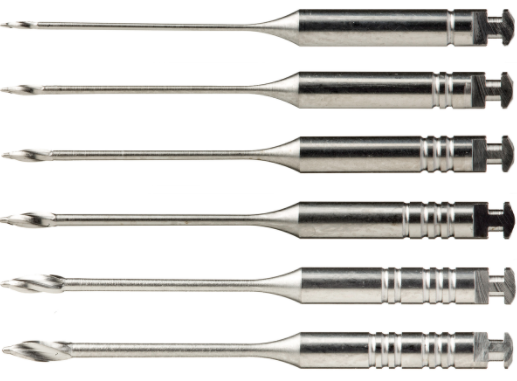 rigid; remove old fillings, sometimes plane/smooth canal walls