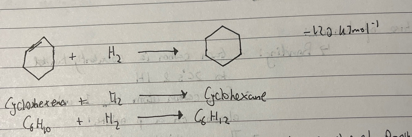 Write the equation for the hydrogenation of cyclohexene stating the enthalpy change for the reaction