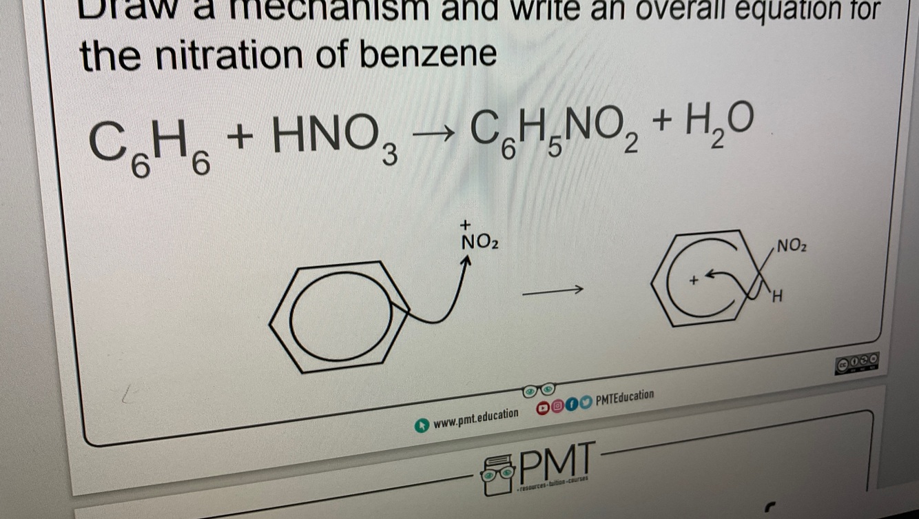 Draw the mechanism for the reaction and general equation for the nitration of benzene