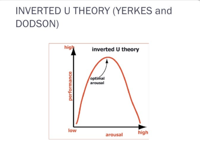 The higher the arousal level the higher the achievement/performance level. The more likely that a well learnt skill (dominant response) will be produced.