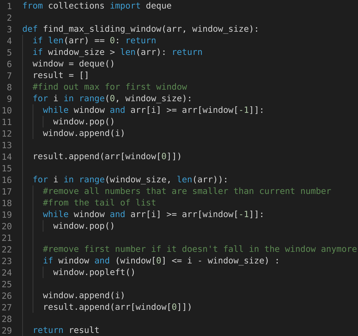 The algorithm uses the deque data structure to find the maximum in a window. A deque is a double-ended queue in which push and pop operations work in O(1) at both ends. It will act as our window.