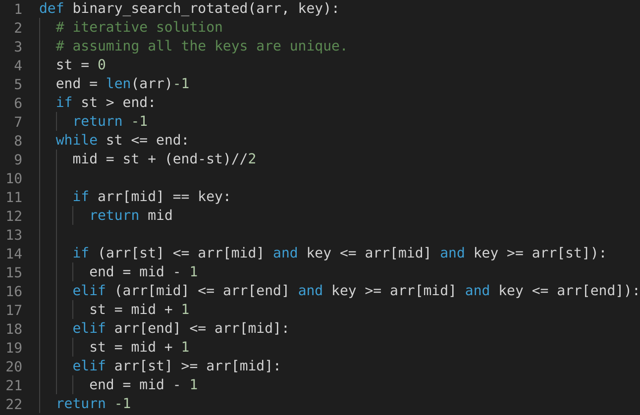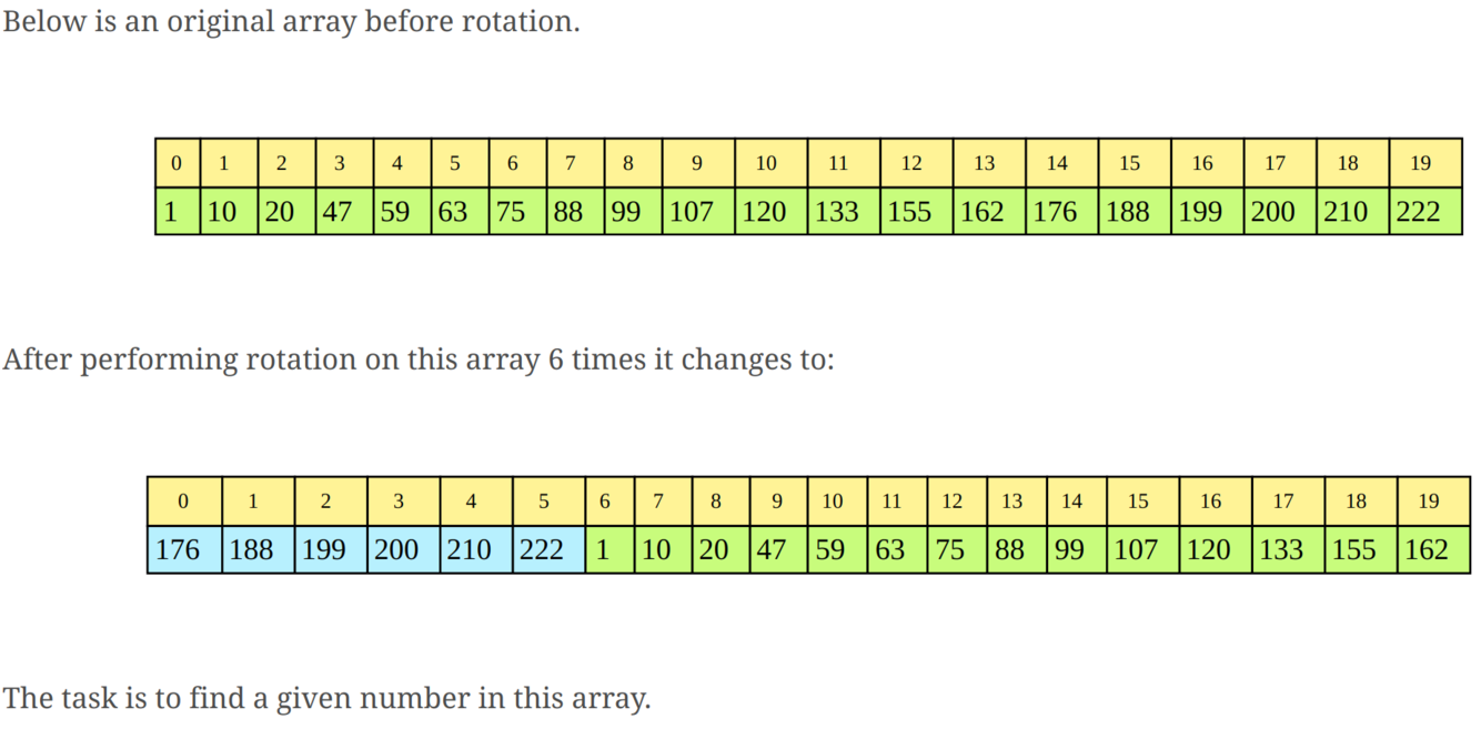 The solution is essentially binary search but with some modifications. If we look at the array in the example closely, we notice that at least one half of the array is always sorted. We can use this property to our advantage. If the number n lies within the sorted half of the array, then our problem is a basic binary search. Otherwise discard the sorted half and keep examining the unsorted half. Since we are partitioning the array in half at each step this gives us O(logn) runtime complexity.