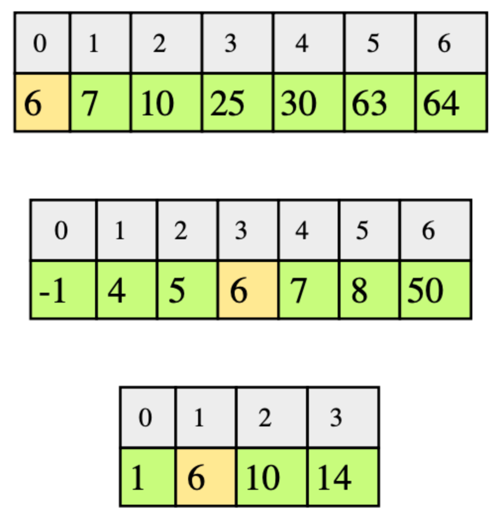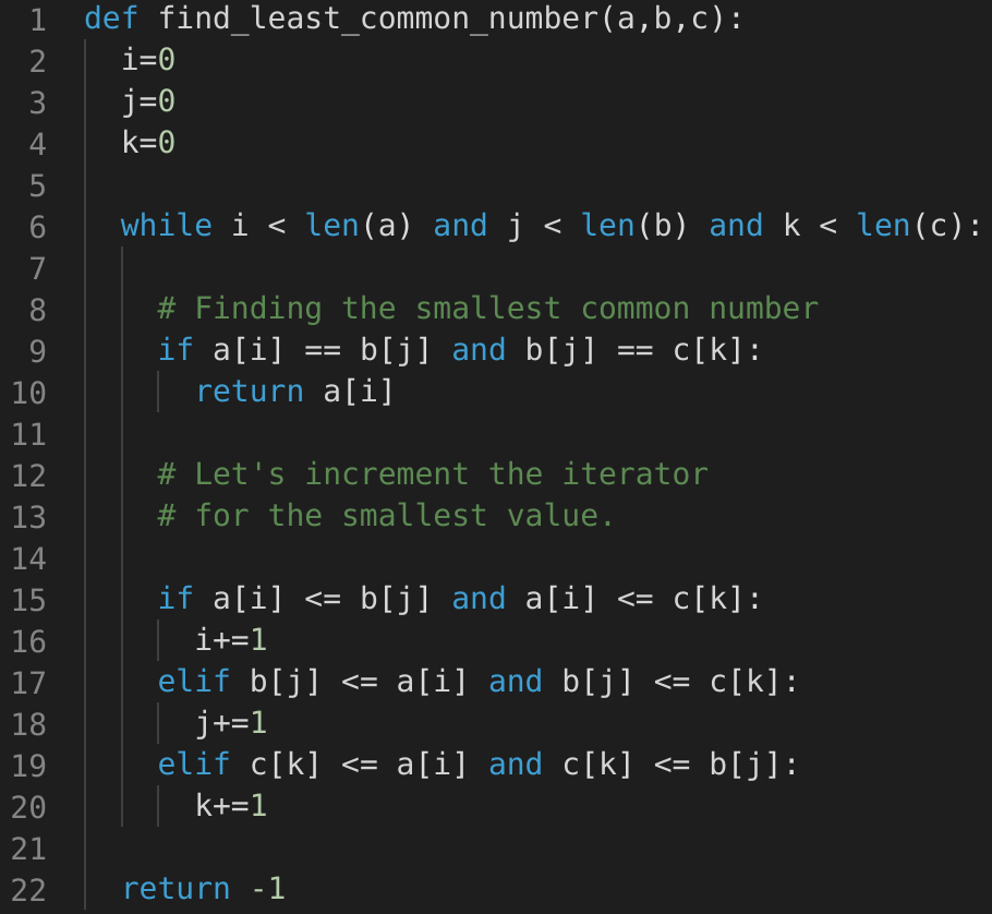 We should try to think of a way where we can take advantage of the fact that the arrays are sorted in ascending order. We will use three iterators simultaneously to traverse each of the arrays. We can start by traversing the arrays starting from the 0th index, which will have the smallest value of each array. If the values at the array indices pointed to by the three iterators are equal, that’s the solution since that will be the smallest value (as arrays are sorted in ascending order) present in all of the arrays. Then, we’ll just return the value. Otherwise, we’ll see which iterator amongst the three points to the smallest value and will increment that iterator so that it will point to the next index. If any of the three iterators reaches the end of the array while we haven’t found the common number, we’ll return -1.