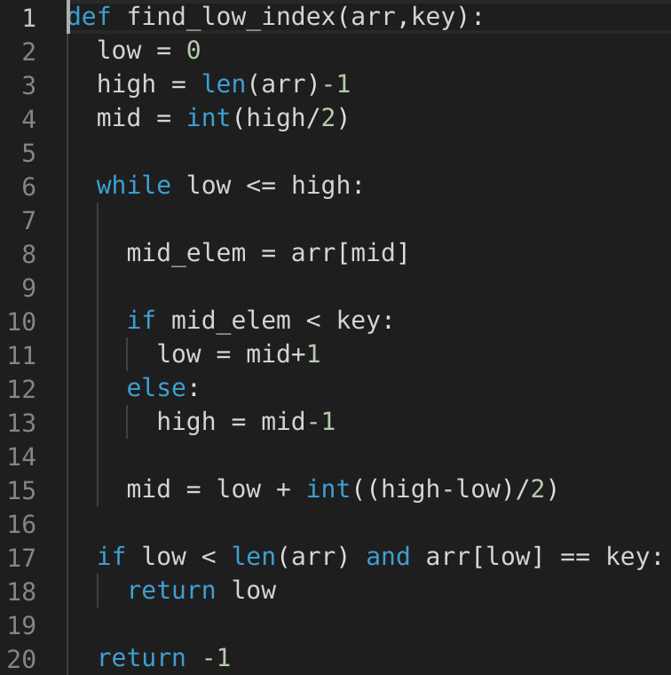 Linearly scanning the sorted array for low and high indices is highly inefficient since our array size is in millions. Instead, we will use slightly modified binary search to find the low and high indices of a given key. We need to do binary search twice; once for finding the low index and once for finding the high index.