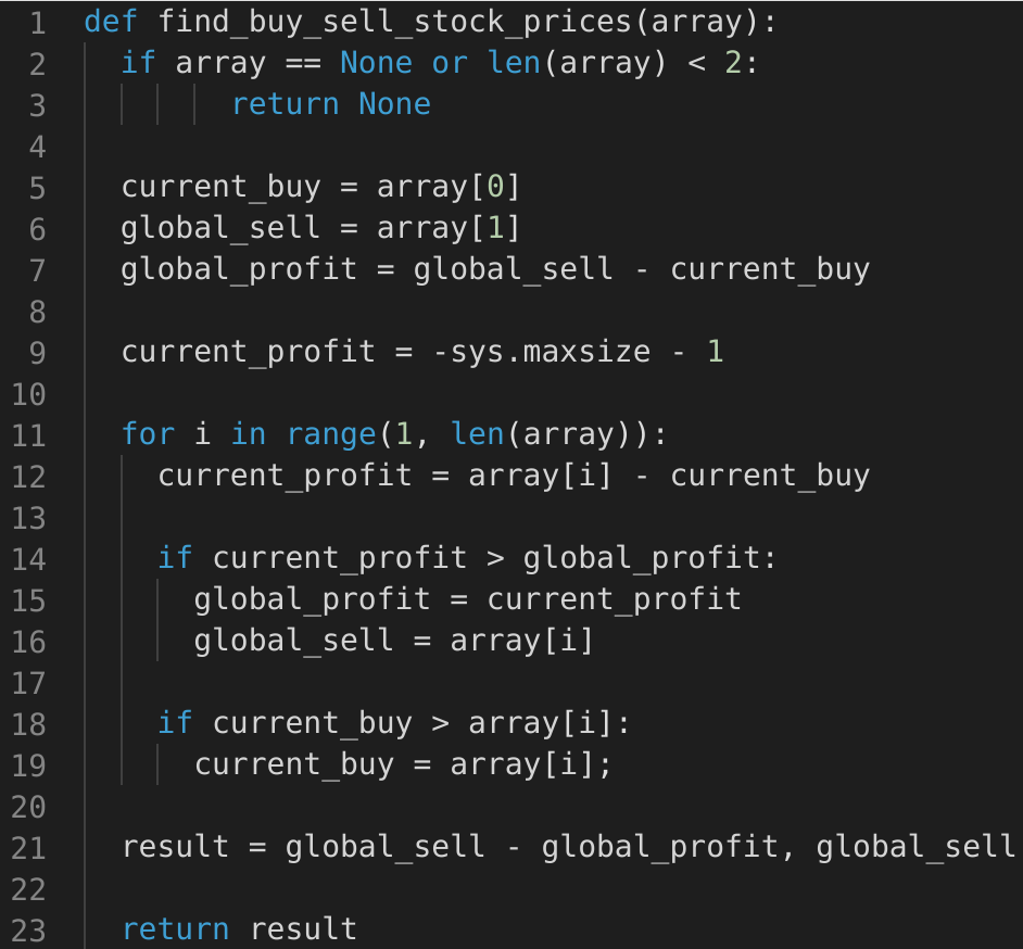 There is a tricky linear solution to this problem that requires maintaining current buy price (which is the smallest number seen so far), current profit, and global max profit as we iterate through the entire array of stock prices. At each iteration, we will compare the current profit with the global profit and update the global profit accordingly.