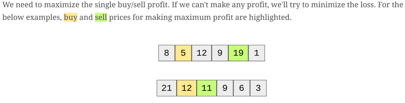 Given a list of daily stock prices (integers for simplicity), return the buy and sell prices for making the maximum profit. We need to maximize the single buy/sell profit. If we can’t make any profit, we’ll try to minimize the loss.