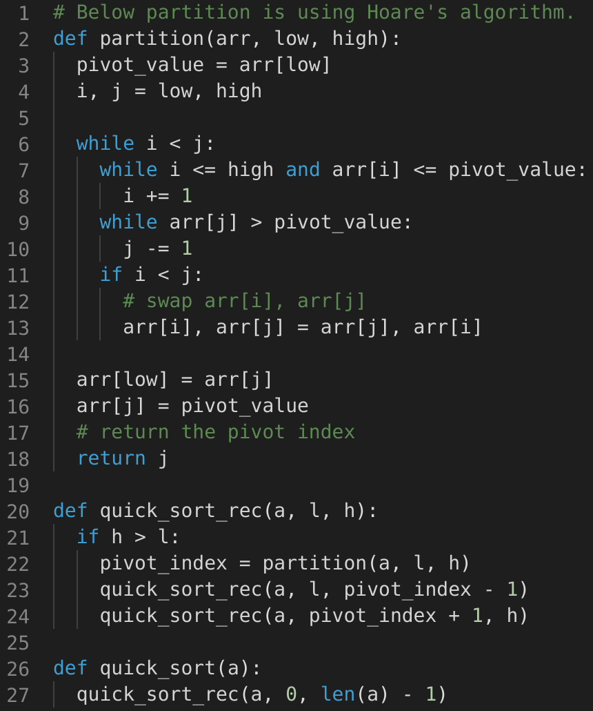 Select a pivot element from the array. We can pick the first element as the pivot if we follow Hoare’s algorithm. Another common approach is to select a random element as the pivot.