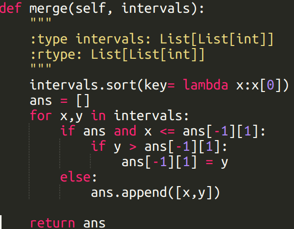 This problem can be solved in a simple linear scan algorithm. We know that input is sorted by starting timestamps. Here is the approach we are following. List of input intervals is given, and we’ll keep merged intervals in the output list For each interval in the input list if the input interval is overlapping with the last interval in output list then we’ll merge these two intervals and update the last interval of output list with merged interval otherwise, we’ll add an input interval to the output list.