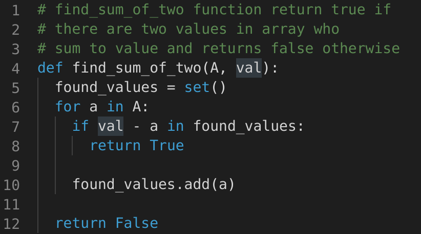 In this solution, we’ll use the following algorithm to find a pair that add up to the target (say ‘val’). Scan the whole array once and store visited elements in a hash set. During scan, for every element ‘e’ in the array, we check if ‘val’ - ‘e’ is present in the hash set i.e. ‘val’ - ‘e’ is already visited. If ‘val’ - ‘e’ is found in the hash set, it means there is a pair (e, val - e) in array whose sum is equal to the given val. If we have exhausted all elements in the array and didn’t find any such pair, the function will return false.