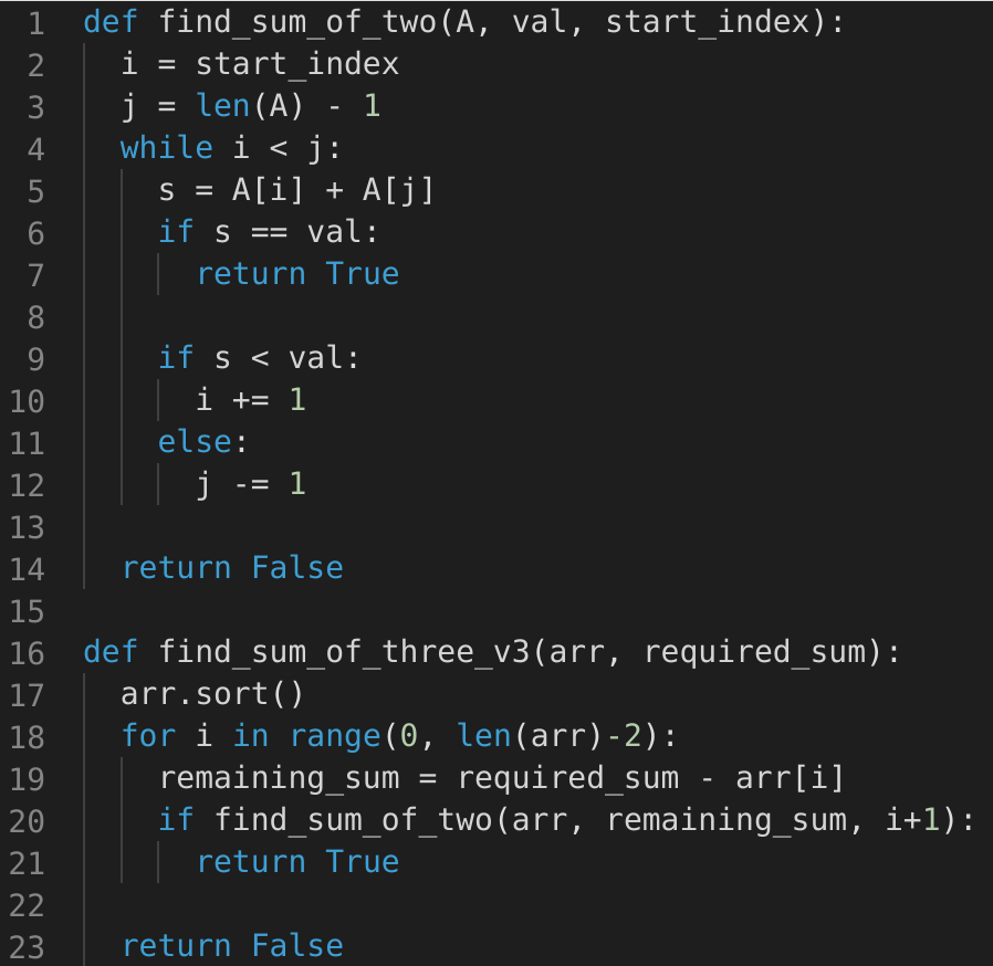 We start with the first element e in the array (at index i = 0) and try to find such a pair (a, b) in the remaining array (i.e A[i + 1] to A[n - 1]) that satisfies the condition: a+b = required_sum - e. We can find such a pair in linear time. If we find such a pair, we have found the solution: a, b and e and thus, we can stop the iteration.