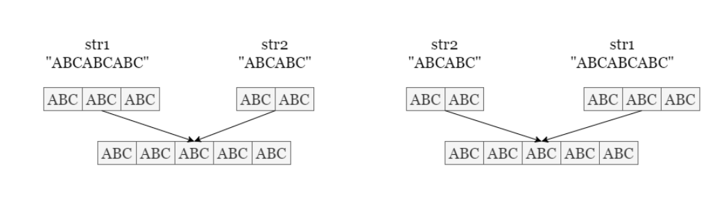 Since both strings contains multiples of the identical segment base, their concatenation must be consistent, regardless of the order (str1 + str2 = str2 + str1).
