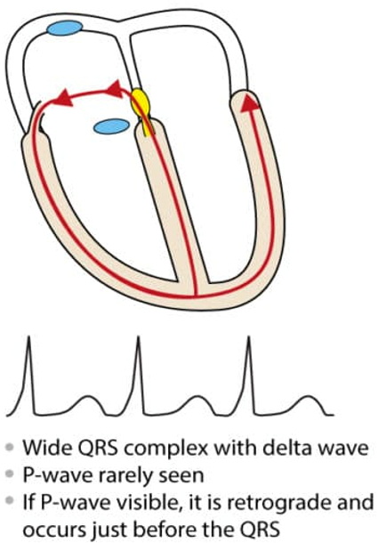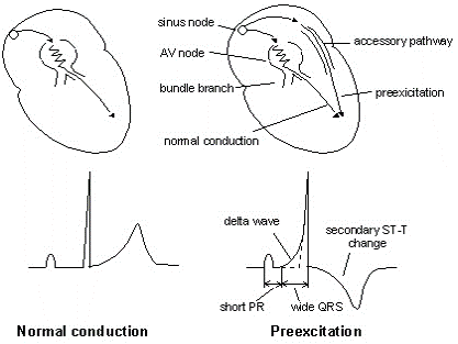 Antegrade (moving forward) conduction through AV node due to accessory pathway