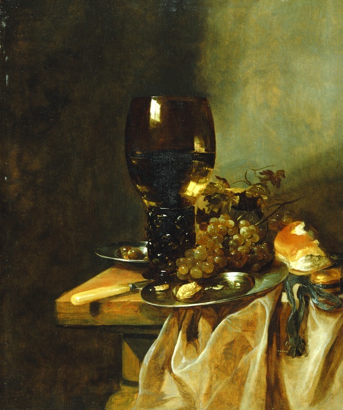 A Roemer with Grapes, a Pewter Plate, and a Roll