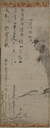 - The Zen monk Ikkyþ seldom painted landscapes, preferring instead such subjects as birds, orchids, prunus, and especially poems and Zen parables written in his powerful calligraphic brush manner. These bokuseki (ink traces) are revered in Japan because they reveal the spiritual character of this eccentric cleric’s life and thought. Ikkyu led a solitary existence, avoiding sustained contact with Kyoto’s large monasteries. He despised the values espoused at such institutions, and openly condemned their distortion of fundamental religious principles. He particularly criticized the close relationships between some monks and the military and government officials of the time. This modest-sized painting is typical of Ikkyu’s work. Noteworthy is Ikkyu’s dark sinewy writing style, which balances the more familiar landscape elements. Easily overlooked at first is the simply rendered figure