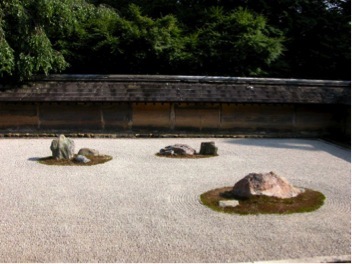 -Ryoanji is most famous for its karesansui (dry landscape) Zen rock garden, thought to date from the late 1400s. It is one of the most notable examples of the dry-garden style — some say it is the highest expression of Zen art and teachings and perhaps the single greatest masterpiece of Japanese culture. No one knows who laid out this simple garden, or precisely when, but it is today as it was yesterday, and tomorrow it will be as it is today.
