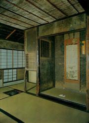 -The Kan’in-no-seki tea room is located at Jukou temple on Daitokuji temple compounds. Build by Miyoshi Yoshitsugu in 1566. This tea room features a three-Tatami-mat layout with a center pilar. Both the center pilar and the alcove pilar are made from the same red pine wood. The ceiling above the host is lowered to indicate the seperation between guests and host. There are various stories which say that the great tea master Rikyu was very fond of this tea room and used it to meditate in. Rikyu and his family graves lie within the temple grounds.