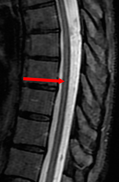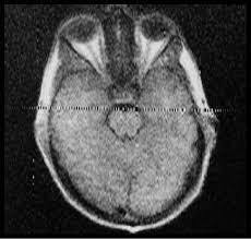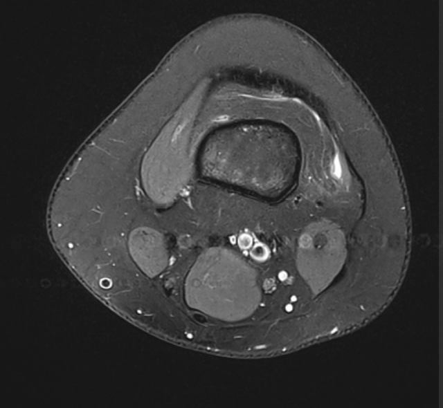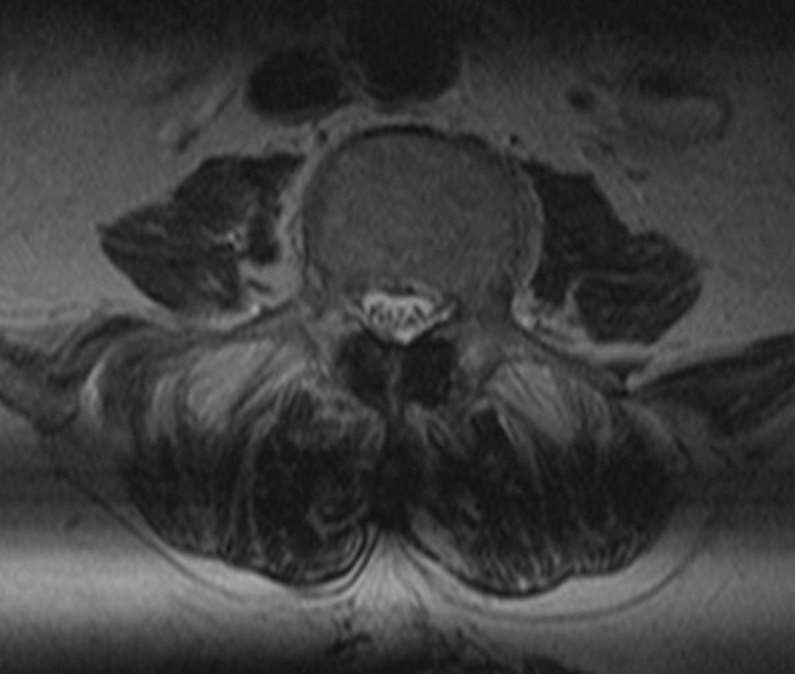 Dark bands of signal loss are seen crossing horizontally through the axial acquisition