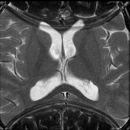 Inhomogenous signal. More pronounced in area of body where large difference in signals.