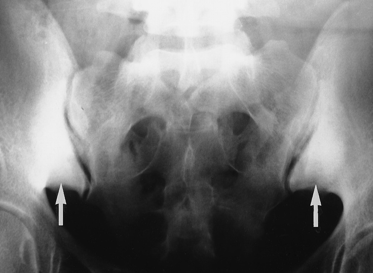 Inflammatory Arthritide: - Multiparous females 20-40 yo - Bilateral symmetric triangular sclerotic areas on the lower half of the ilium. - Joint space is normal