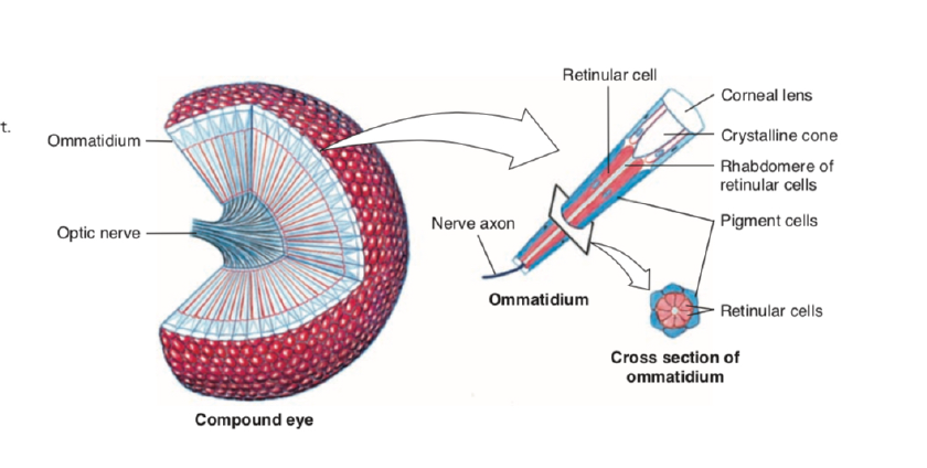 Arthropoda haben 1 Paar laterale Komplexaugen. (Facettenaugen). Diese bestehen aus zahlreichen Omatidien. Ommatidien besitzen gemeinsame basale Matrix und gemeinsame konkave Oberfläche.