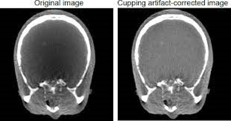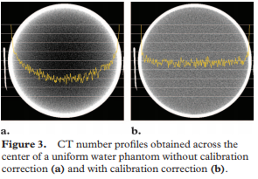 X rays passing through the middle portion of a uniform cylindrical phantom are hardened more than those passing though the edges because they are passing though more material. As the beam becomes harder, the rate at which it is attenuated decreases, so the beam is more intense when it reaches the detectors than would be expected if it had not been hardened. Therefore, the resultant attenuation profile differs from the ideal profile that would be obtained without beam hardening (Fig 2). A profile of the CT numbers across the phantom displays a characteristic cupped shape
