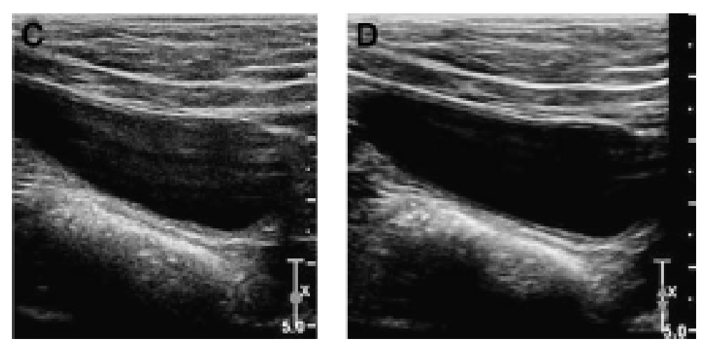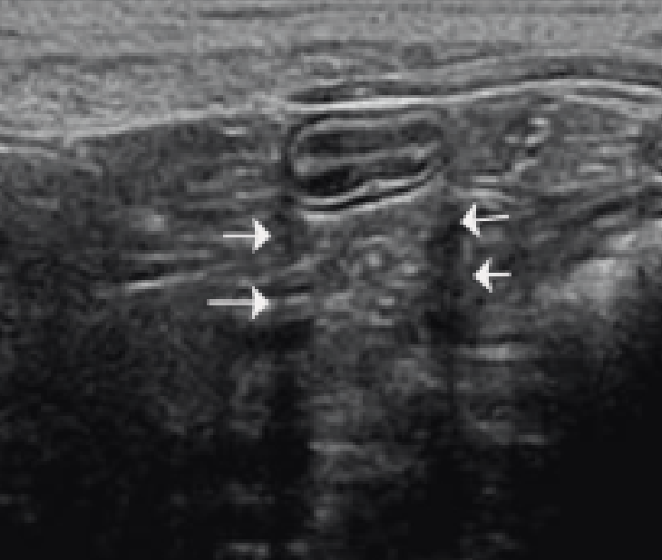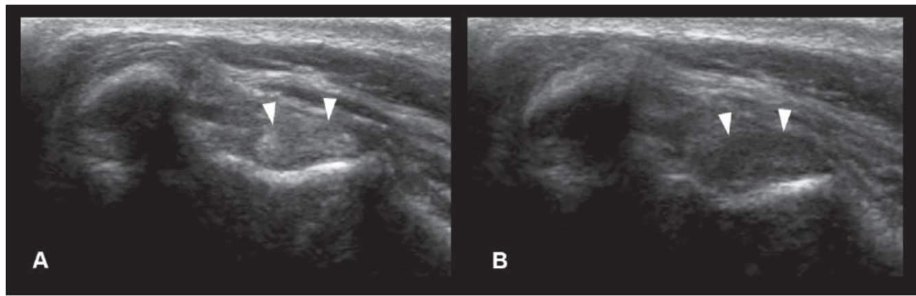Anisotropy artifact: angle of insonation alters reflective pattern. Normal or hyperchoic when perpendicular; hypoechoic appearance (‘false lesion’) when off angle.