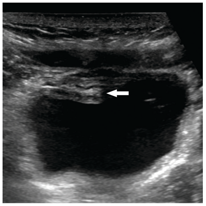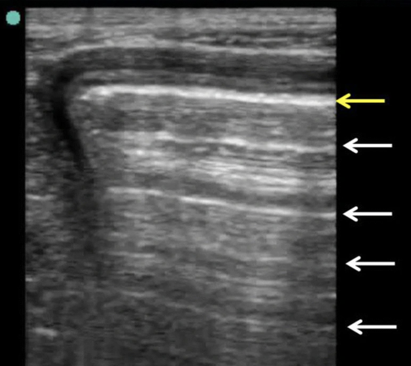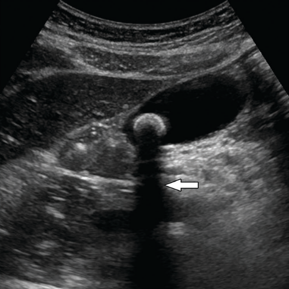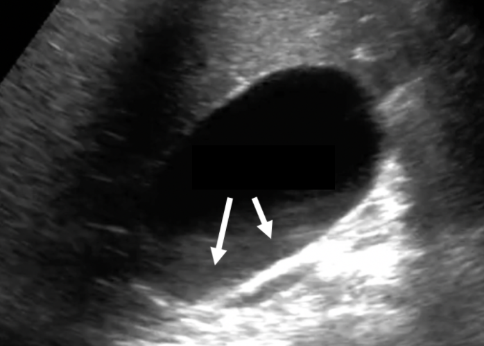 Acoustic shadowing artifact: Structures that are strong reflectors or attenuators cause reduction in the beam intensity distal to them, resulting in a dark shadow.