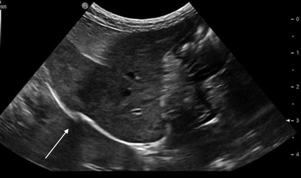 Edge shadowing artifact: Refractive artifact that occurs at the edge of a large curved boundary with a different speed of sound than that of the surrounding tissues