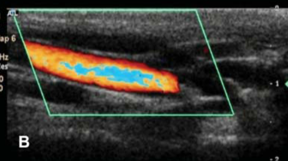 Aliasing artifact: occurs when the doppler shift frequency exceeds the Nyquist limit (1/2 PRF) –> information is mapped to the wrong side of baseline.