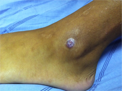 Lesões com preferência pelas extremidades, especialmente as mãos, com presença de pústulas ou vesículas indolores, com base eritematosa e centros hemorrágicos ou necróticos