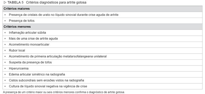 O diagnóstico diferencial inclui todas as causas de edema articular, **como as hemartroses, que ocorrem após trauma ou espontaneamente em pacientes com hemofilia. Edema inflamatório articular pode ocorrer na artrite séptica, artrite gotosa, pseudogota, artrites virais, artrite reativa e na doença de Lyme. **A maior dificuldade nesses pacientes é a diferenciação entre os quadros de artrite séptica e artrite gotosa; a Tabela 5 apresenta os critérios diagnósticos para artrite gotosa aguda.