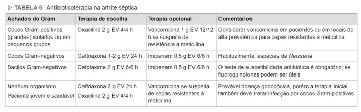 Entre os exames que podem ser realizados no líquido sinovial estão a** citologia e a bacterioscopia com coloração de Gram, **que consegue identificar microrganismos em 30-50% dos pacientes com artrite séptica. Exames adicionais do líquido sinovial como glicose e DHL são de pouca utilidade (Tabela 4).