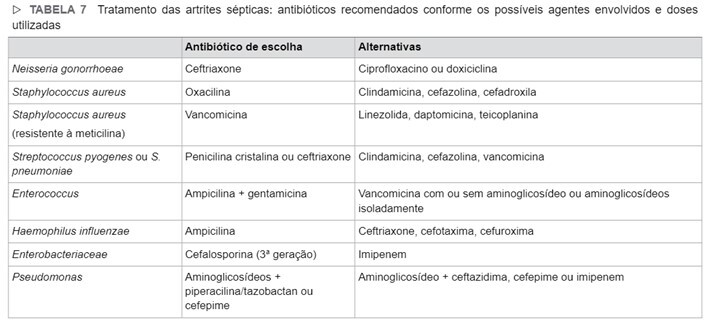 No caso de suspeita de artrite gonocócica,** o tratamento deve ser feito com ceftriaxone em dose de 1 g EV ou IM diária ou a cada 12 horas por 7 a 10 dias. A dose de 1 g diária é recomendada pelo Center of Diseases Control norte-americano; após 3 dias de tratamento muitos pacientes estão assintomáticos**. Outras opções antibióticas incluem azitromicina 1 g oral dose única e doxiciclina 100 mg a cada 12 horas por 7 dias. A forma poliarticular da artrite gonocócica é mais facilmente tratável, mas a forma purulenta requer 7 a 14 dias de tratamento antibiótico.