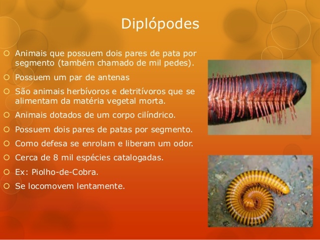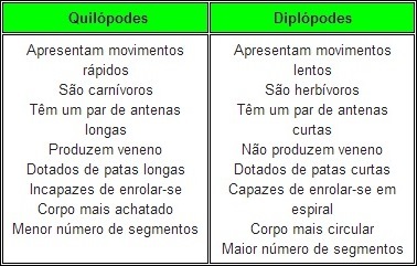 Os diplópodes apresentam dois pares de patas por segmentos, e seu corpo é dividido em cabeça, tórax e abdome. Os quilópodes possuem apenas um par de patas e corpo dividido em cabeça e tronco. Como exemplo de diplópodes, podemos citar o embuá, e entre os quilópodes, está a lacraia