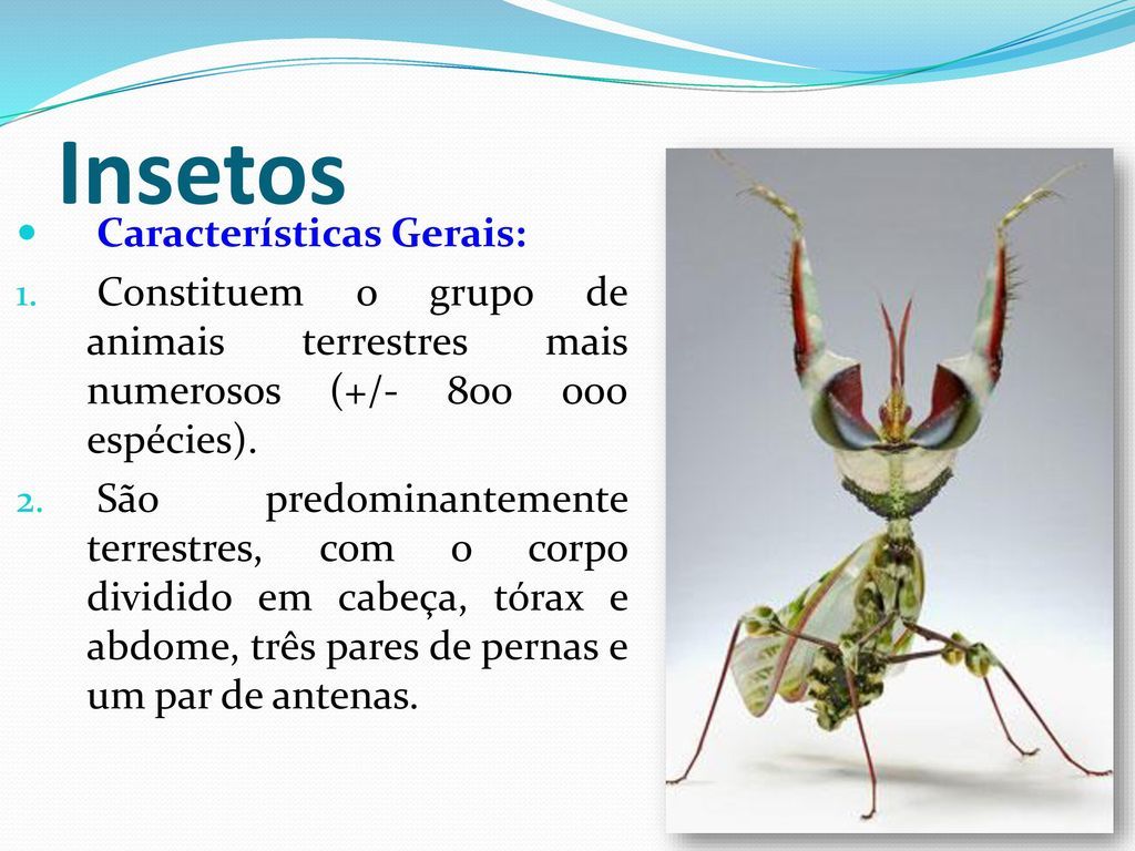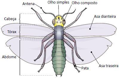 Os insetos são invertebrados com exoesqueleto quitinoso, corpo dividido em três tagmas, três pares de patas articuladas, olhos compostos e duas antenas.