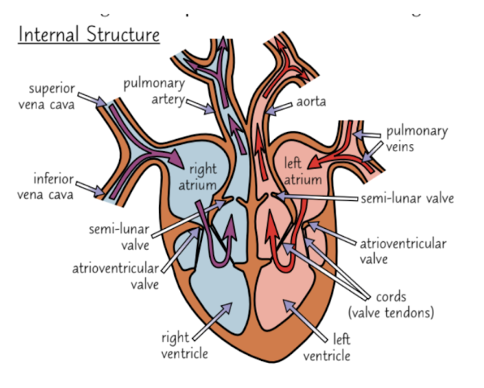 Vena cava –> right atrium –> AV valve –> right ventricle –> SL valve –> pulmonary artery –> lungs –> pulmonary vein –> left atrium –> AV valve –> left ventricle –> SL valve –> aorta –> body