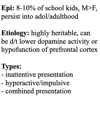 Describe the etiology & types of ADHD