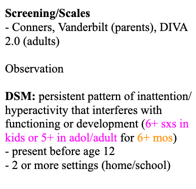 Describe the screening & Diagnosis of ADHD