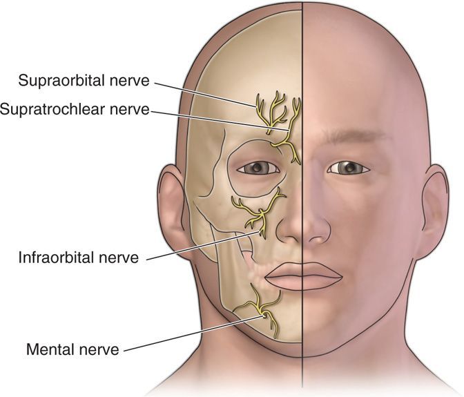 Inject perpendicular to skin at orbital rim at midpupillary line to numb forehead and frontal scalp