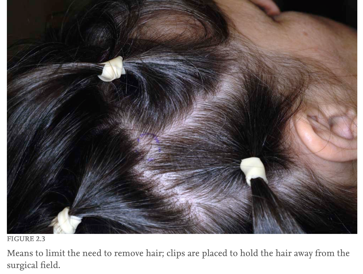 If these methods do not prove sufficient, and removal is required, the hair should be judiciously clipped at the skin with a pair of scissors or electric clippers before establishing a sterile field.