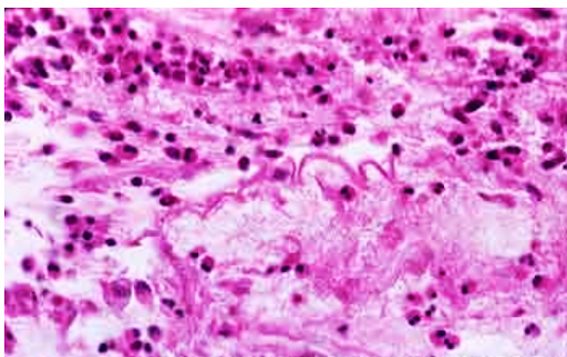 Muco condensado envolto por numerosas tênues fibrilas.
