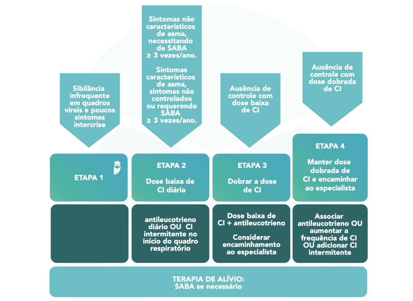 Beta 2 agonista de curta duração (SABA 3 doses 20/20 min; se não melhorar ou crise grave → ipratrópio);